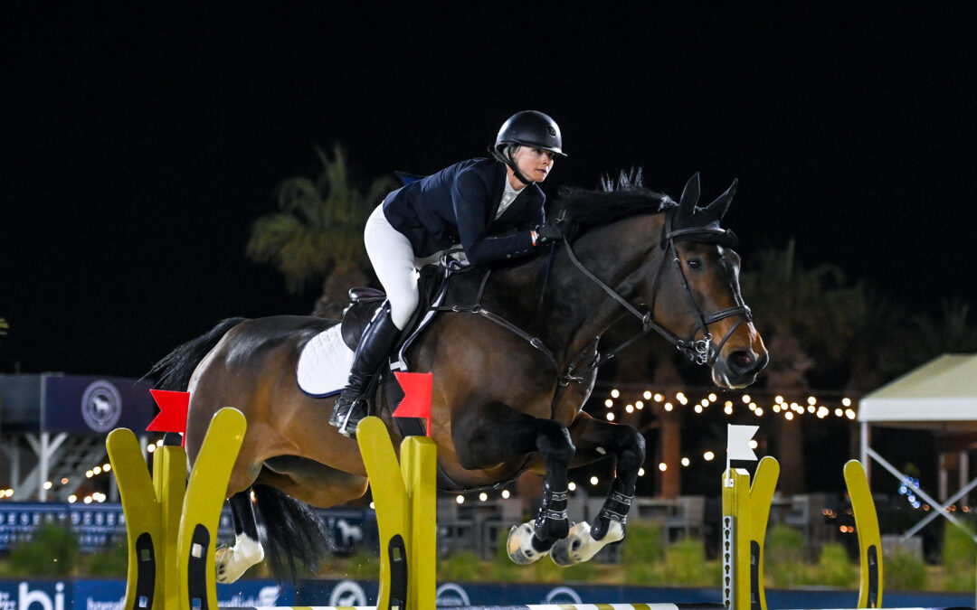 Thermal, CA – January 24, 2025 – Friday night’s $10,000 Interactive Mortgage 10 & Under Futurity Series gave 42 young horses the opportunity to shine under the lights at the Desert International Horse Park, but none shone brighter than Source Code. Jessica Gleason rode the 8-year-old Dutch Warmblood to victory by a margin of more than 2.5 seconds on January 24, during Desert Circuit 3, presented by American Wild Horse Conservation.