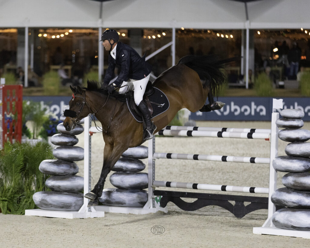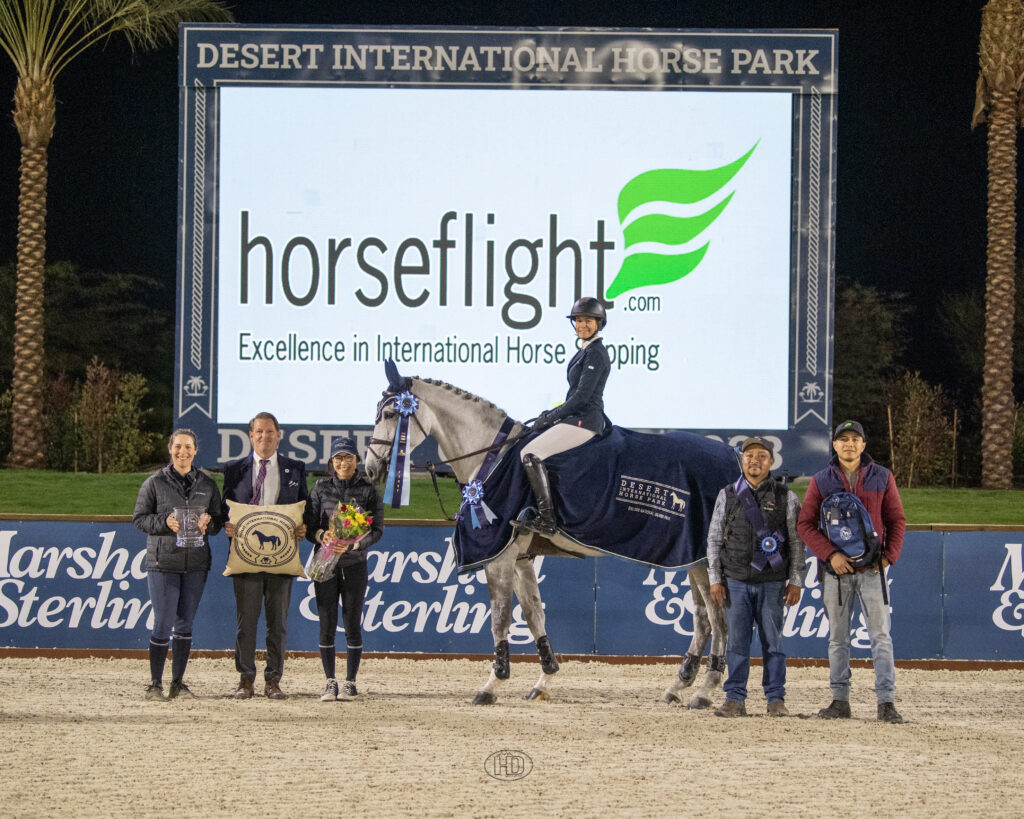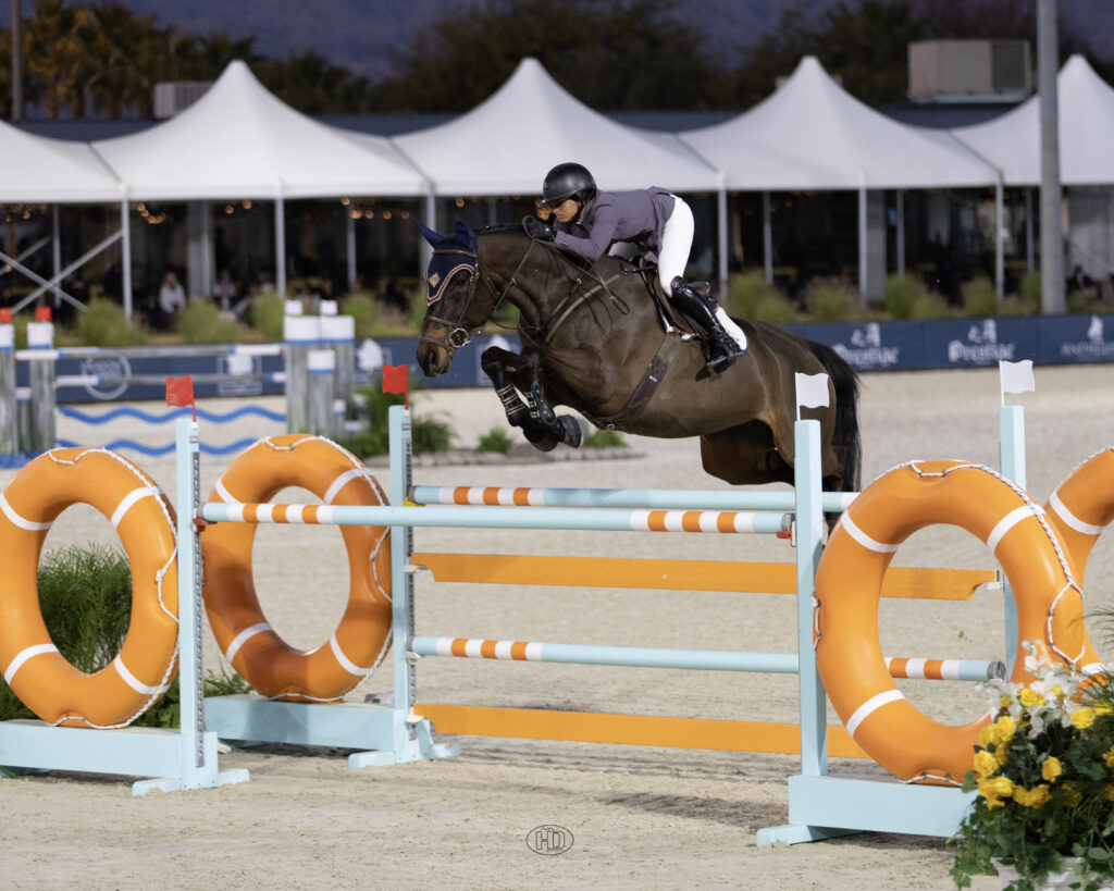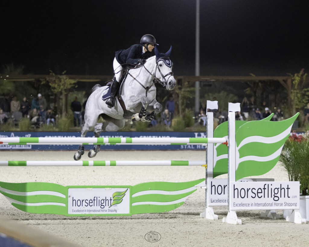 Olivia Brown faced an A-list of jump-off competitors in Saturday night’s $50,000 HorseFlight National Grand Prix at Desert International Horse Park (DIHP). Up against some heavy hitters with arguably their top horses, she didn’t let the pressure get to her, despite being on a less experienced mount. With Caroline Burke’s Bling VD Duvelshoeve Z, she clinched the win in a blazing fashion.