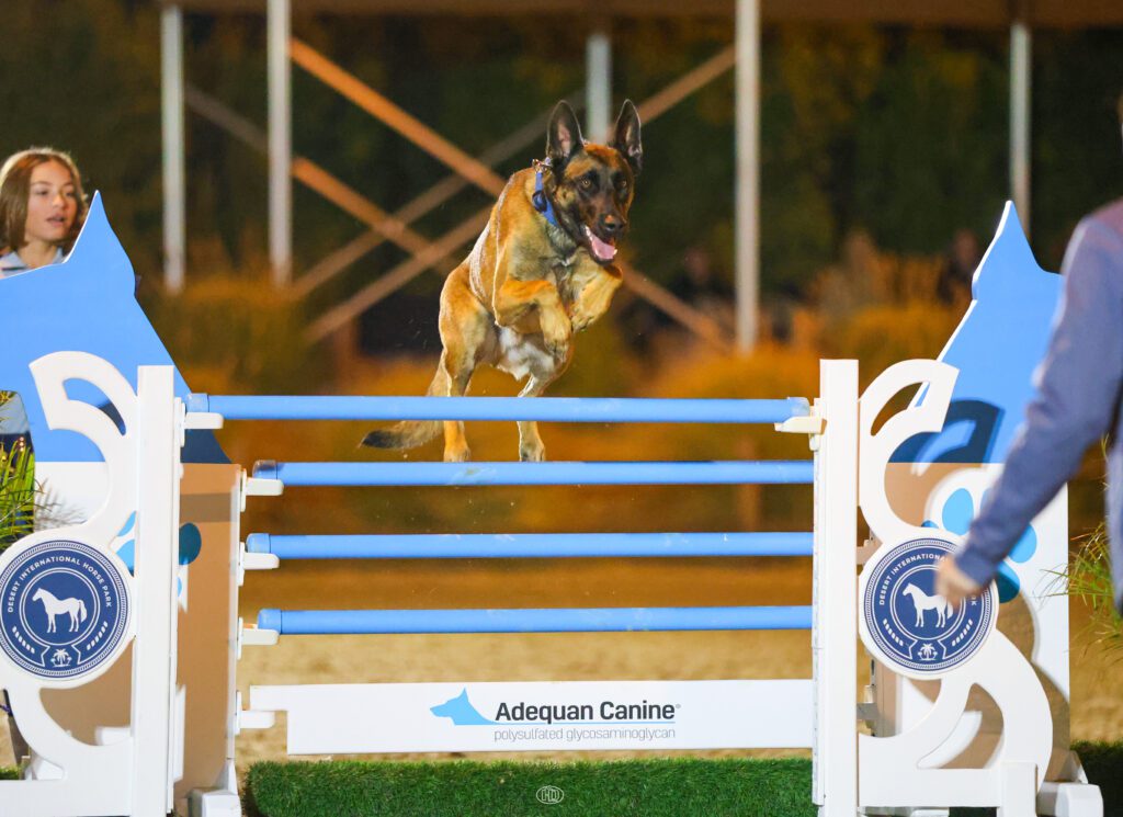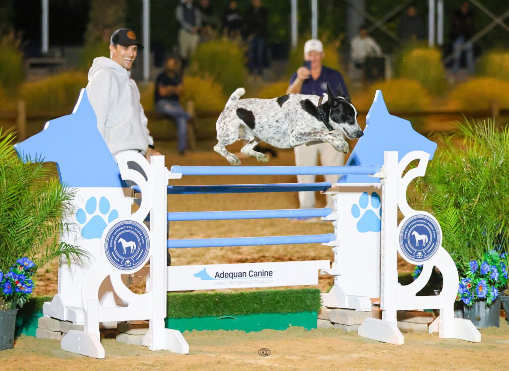 The dogs were out to play tonight! Nearly 40 dogs partook in the $1,000 Adequan® Dog Puissance to Benefit USHJA, and we had a tie at the top. Zeno and Louie took the win, both clearing 4’4″ in height with over one foot in width. Runner-up honors went to Daisy who was just shy of clearing the final fence. Molly won the small dog category, clearing a fence over 3′ in height! All winning dogs were given prizes for their efforts in this fan-favorite class.