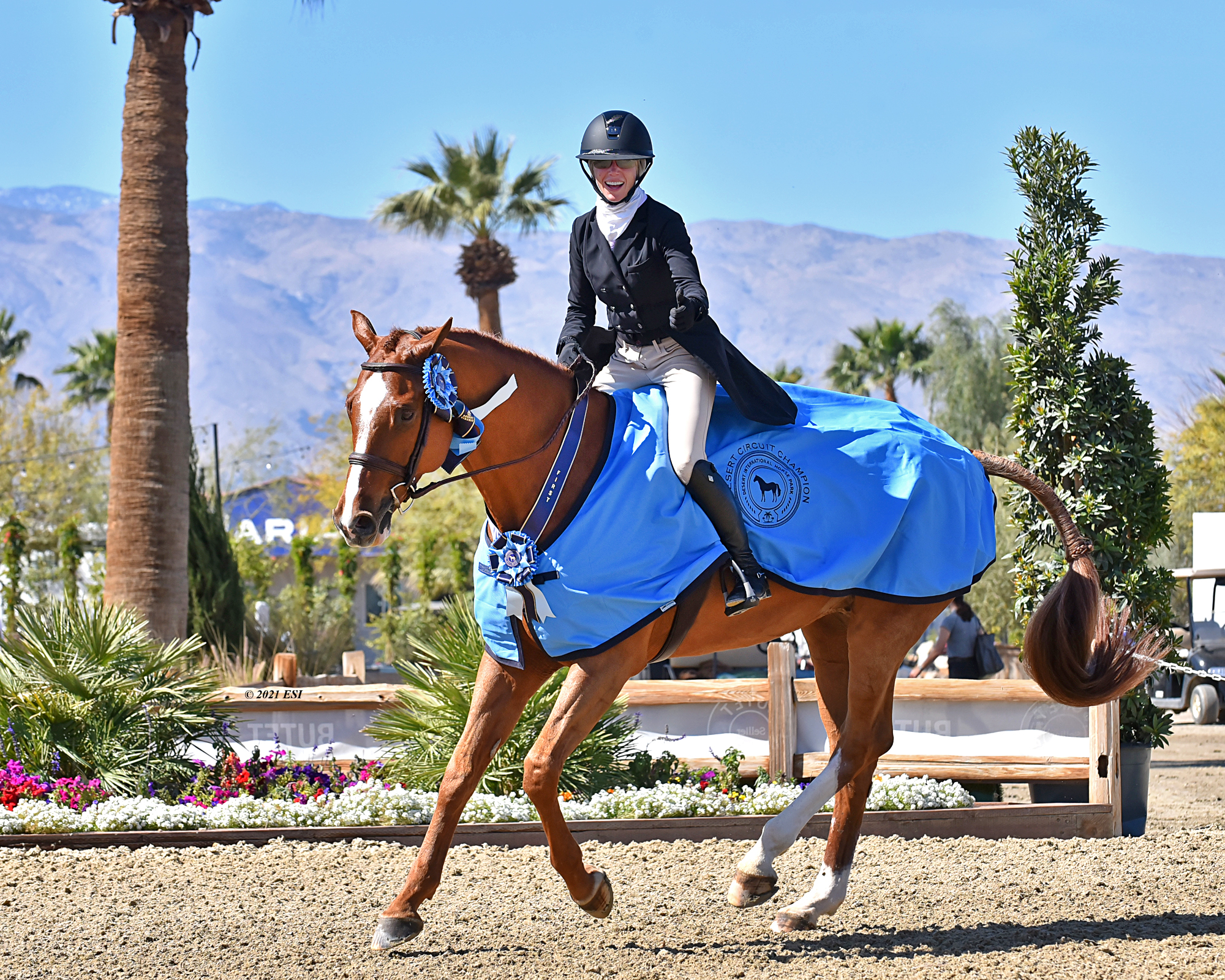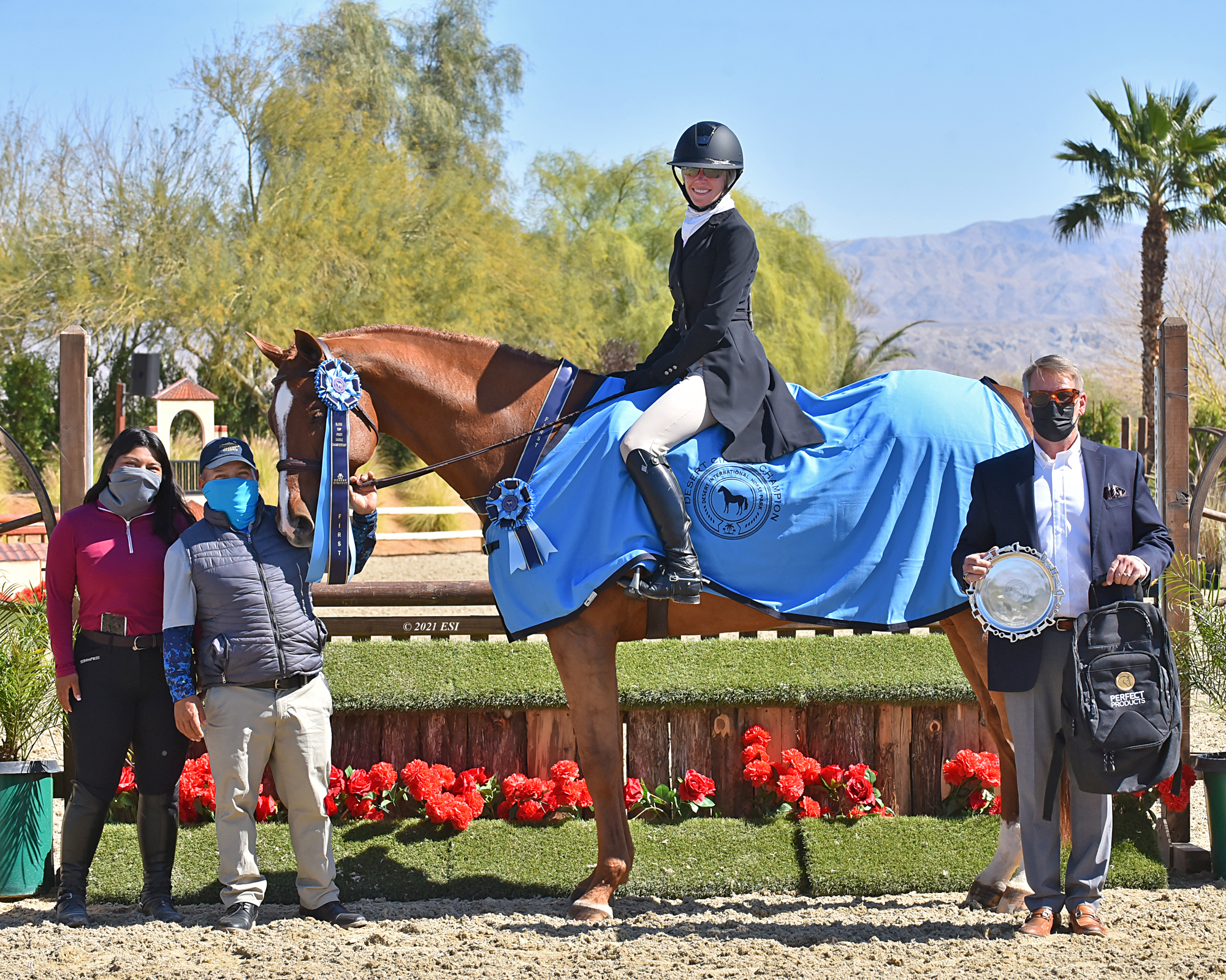 THERMAL, Calif. – Mar. 5, 2021 – The inaugural $1,000 DIHP Under Saddle Championship, sponsored by Perfect Products, took place Friday morning at Desert International Horse Park’s Desert Circuit VI. Alexis Taylor (Medina, WA) and County Line stole the show, claiming victory against twenty-one other entries. In a close second place was Lauren Padilla (Palos Verdes Estates, CA) and Sprucedale Inc’s So Enchanted. Rounding out the top three was Chelsea Brittner (Sacramento, CA) and Lysander, owned by Chestnut Hill LLC.