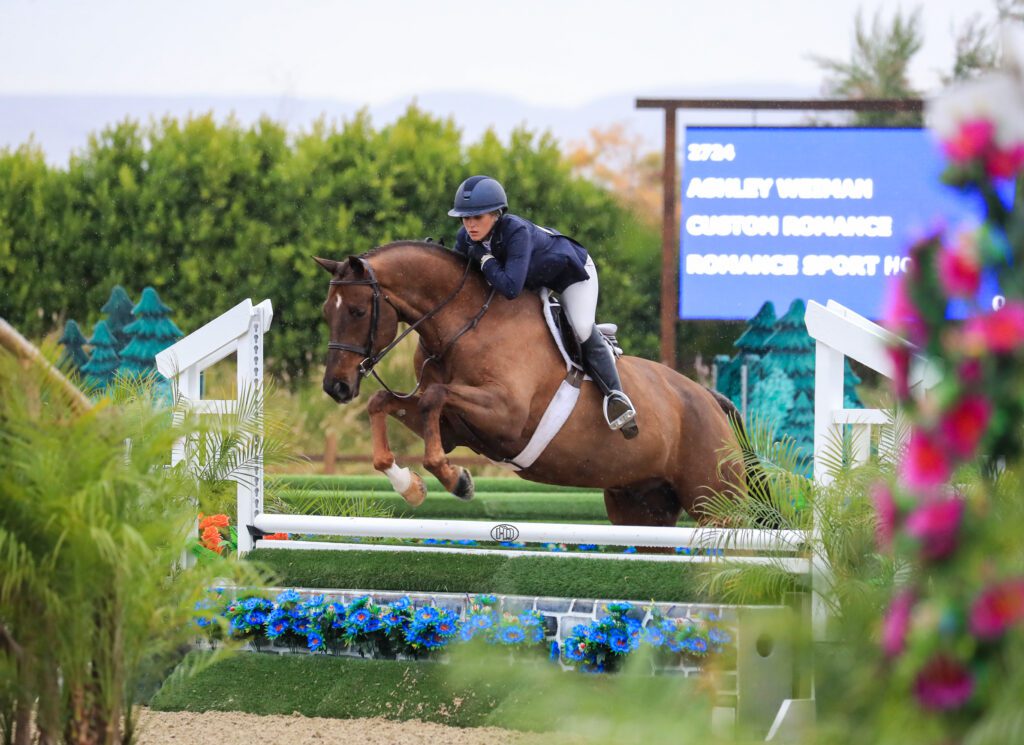 “‘Cheeto’ is 8 years old doing the 3’3” Green [Hunters] with Nick Haness and just started doing the 3’ A/Os with me,” Weiman, of Ramona, CA, remarked of Custom Romance. “He’s a little green but he’s stepped up to the plate and has been champion our past two times out, and he’s been champion the past two times in the 3’3” Greens. I’m super excited to keep showing him.”