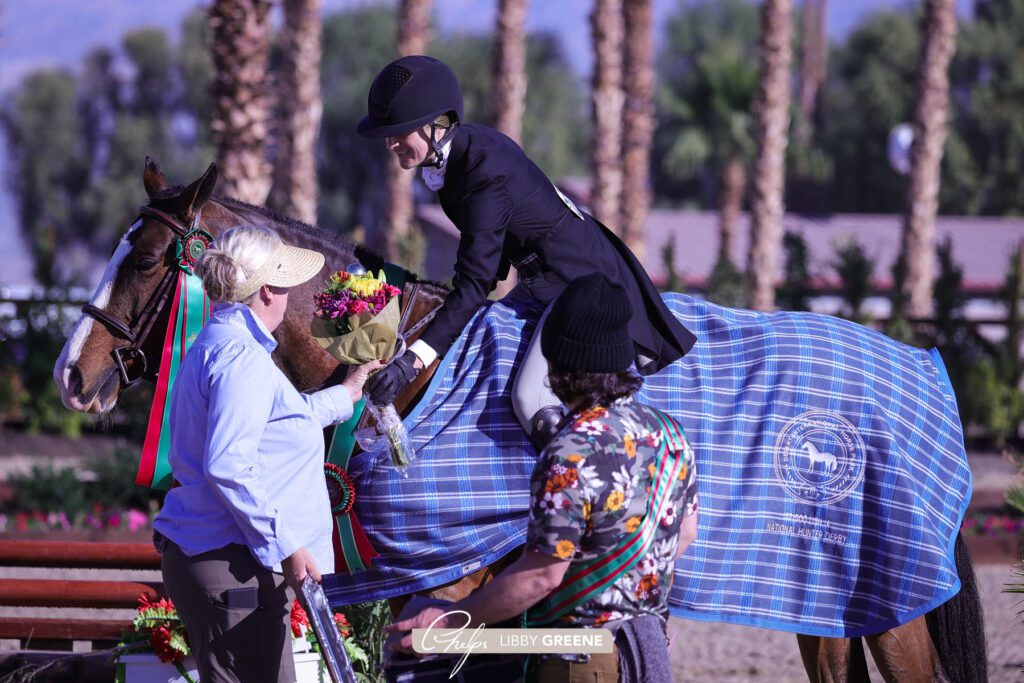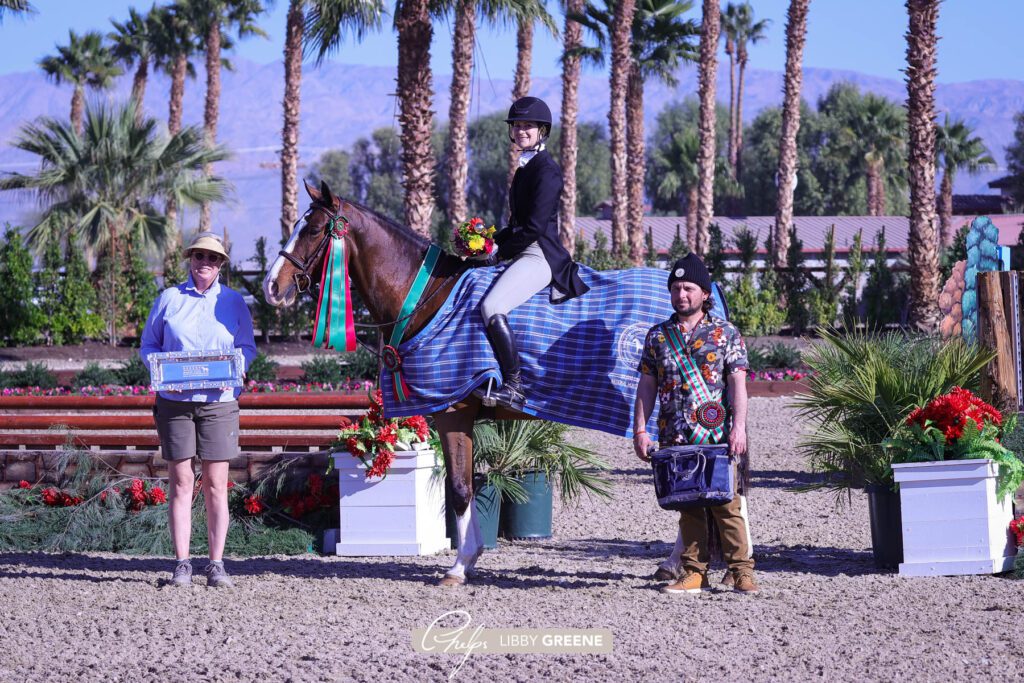 Thermal, Calif. – Dec. 4, 2021 – The Grand Eq Arena kicked off Saturday morning with the $2,500 USHJA National Hunter Derby, sponsored by Ritz Carlton. A competitive group of junior, amateur and professional riders took center stage to showcase their skills in the decorated derby ring. Three talented pairs emerged victorious after trying their hands over a classic derby round and then taking their turns over the tactful handy round. In the end, it was Chelsea Brittner and Berry De Maillet who took home the championship honors with a total high score of 188. Chad Mahaffey and No Reservations were awarded reserve champion, while Augusta Iwasaki and Seaside rounded out the top three.