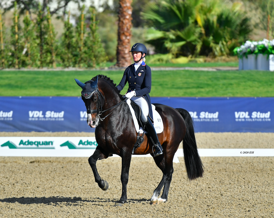 THERMAL, Calif. – November 21, 2020 – American rider Charlotte Jorst topped the competition today in the FEI Grand Prix Freestyle CDIW, presented by Buffini and Company. With her trusted mount Kastel’s Nintendo, Jorst secured the top spot with a personal best score of 76.530%. Kastel’s Nintendo is a seventeen year old Dutch Warmblood stallion by Negro out of Monaco.