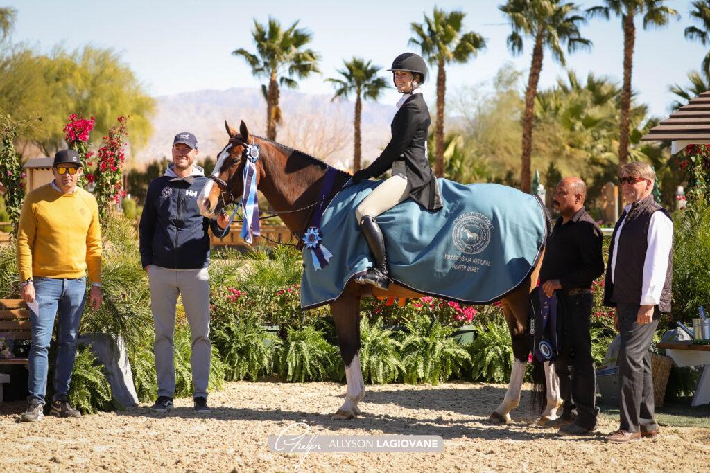 Thermal, Calif. – Feb. 4, 2022 – Hunter derby athletes took to Hunter 1 Friday morning to partake in the $10,000 Valencia Saddlery USHJA National Hunter Derby – Open and $10,000 Domino High Voltage USHJA National Hunter Derby – Junior/Amateur and earn the top spot and lion’s share of the generous prize money. Over a track set by Kevin Holowack, 39 entries came forward in the Open section, and 46 entries vied for the win in the Junior/Amateur section. Topping the $10,000 Valencia Saddlery USHJA National Hunter Derby – Open was Chelsea Brittner and Kaylin Faidi’s Berry De Maillet with a score of 183.25. Skylar Wireman and the MZ Farms LLC entry Bonne Starlight took the win in the Junior/Amateur section after riding to a total score of 182.