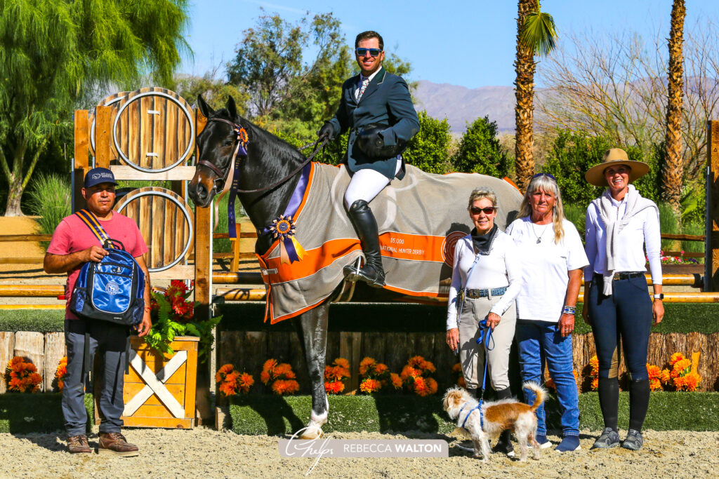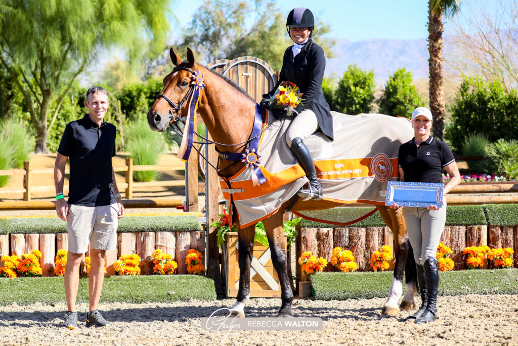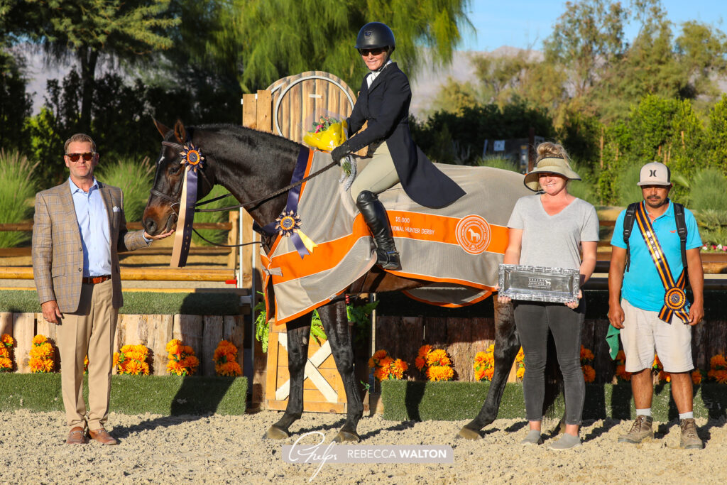 Thermal, Calif. – Nov. 5, 2021 – Hunter derby action took center stage on Friday during the Desert International Horse Park’s National Sunshine Series I. The $5,000 USHJA Junior/Amateur National Hunter Derby, sponsored by Platinum Performance, kicked off the day with Christina Smith earning the top score aboard Soon to Be. The $5,000 USHJA Open National Hunter Derby, sponsored by Ritz Carlton, was split into two sections, with Nick Haness winning the Section A riding Reese’s, and Lisa Wall claiming the leading title in Section B with Tangled Up In Blue.