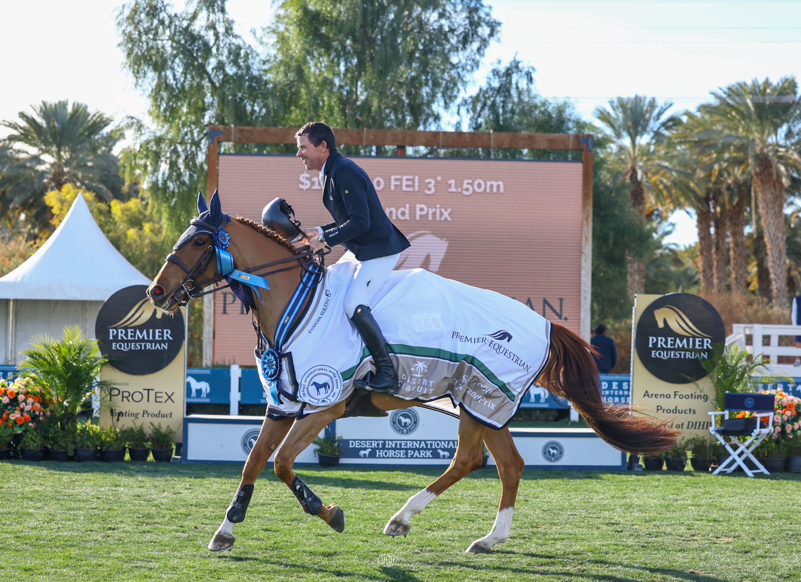 Thermal, CA – February 15, 2025 – This week marked Conor Swail’s first time jumping One Edition in FEI competition, so Swail considered February 15’s $117,000 Premier Equestrian CSI3* Grand Prix a “fact-finding mission.” At the end of the Saturday afternoon class at the Desert International Horse Park, at least one fact was apparent: Swail and One Edition make a winning combination. The pair bested a six-horse jump-off to take home victory in the Desert Circuit 6 featured event.