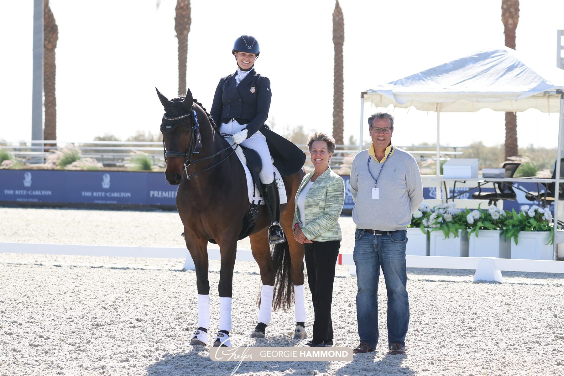 After dominating the Small Tour in last year’s Desert Dressage series at DIHP, Darnell has been working hard to move her 9-year-old KWPN gelding Harrold S (Vivaldi–Zantana Sollenburg, Fidermark) up to the next level. She made the long trip down from Mount Vernon, Washington well worth it as she won both Medium Tour classes during Desert Dressage II, first taking home the blue in the Beverly J. Gepfer & Kirk R. Martens Foundation CDI3* Intermediate A with a 70.49% before returning Sunday to top the Deb Pulver CDI3* Intermediate II with a 69.882%.