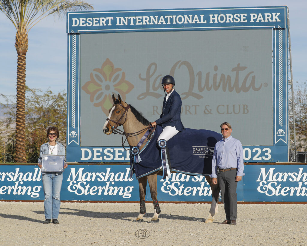 Gregory Wathelet (BEL) and Ace Of Hearts in their winning presentation, pictured with Candace Bengtson of La Quinta Resort & Spa. Photo by High Desert Sport Photo