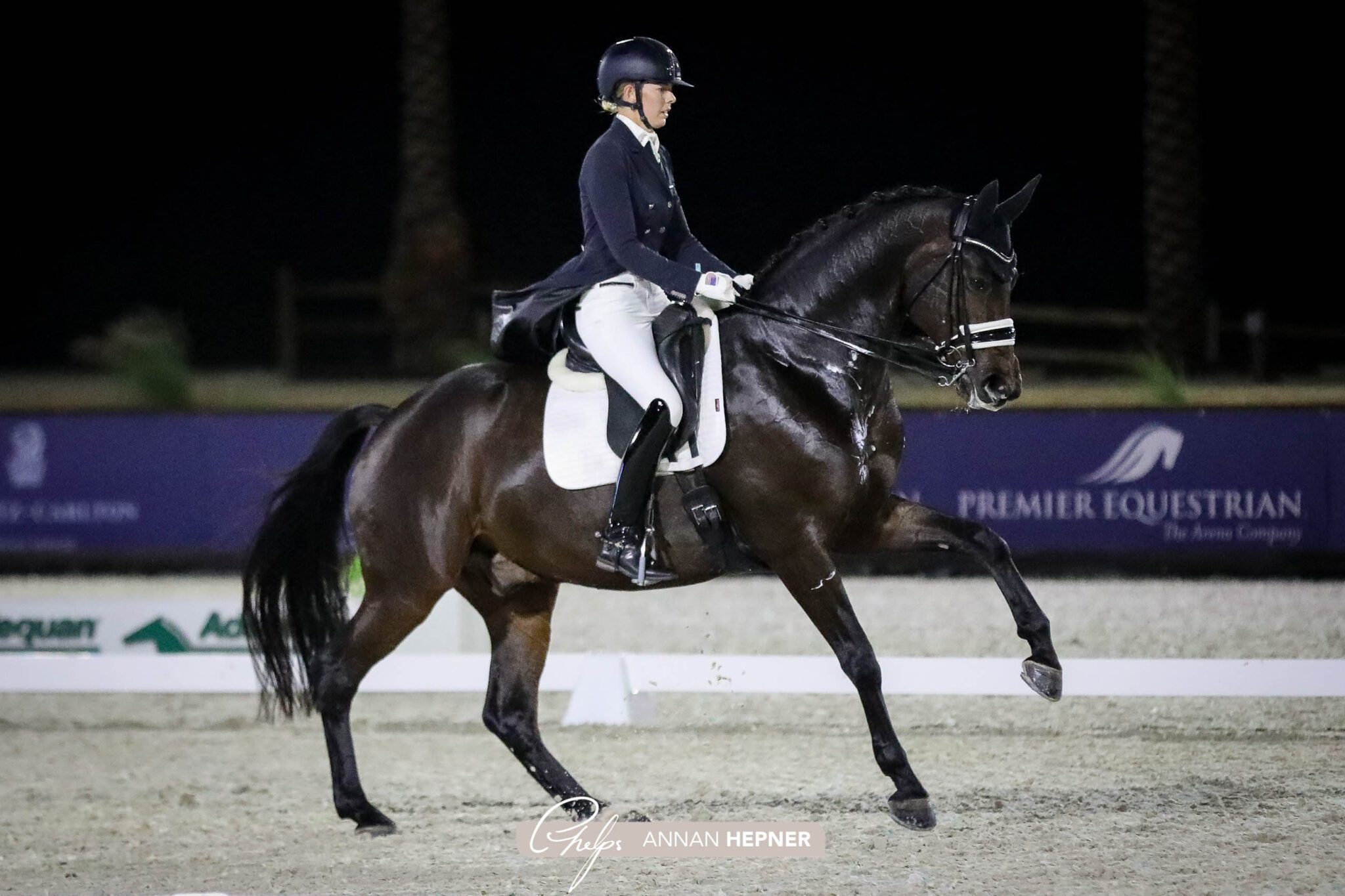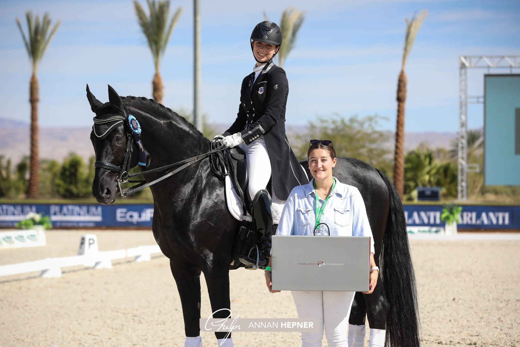 The Elizabeth Keadle CDI3* Grand Prix Special kicked off Saturday evening’s action. After finishing in second place during Friday’s Hof Kasselmann CDI3* Grand Prix, Seidel and the 12-year-old Danish Warmblood mare (Florett AS – Orchidee T, Donnerhall) made their way to the winner’s circle. The duo rode to a score of 71.490% to earn their spot at the top of the leaderboard, receiving high marks for their collected trot and pirouettes. Seidel and Equirelle look forward to returning to the DIHP in November for Desert Dressage II before heading to Wellington, Florida for the winter show season.