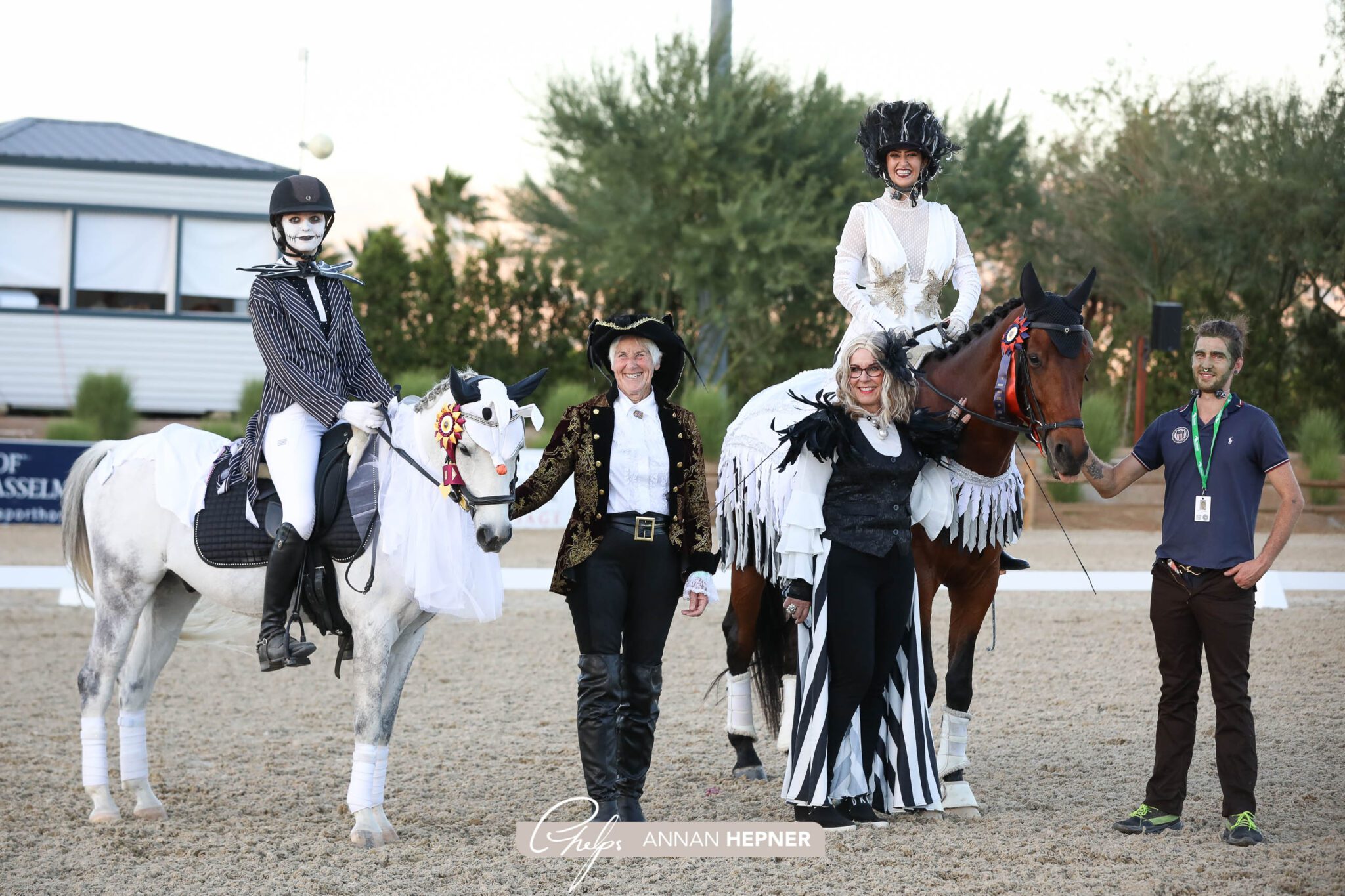 Thermal, Calif. – Oct. 23, 2021 – Exhibitors got into the Halloween spirit during Saturday’s Adequan® Desert Dressage I CDI-W and Spooktacular National Dressage Show, presented by Platinum Performance, at the Desert International Horse Park (DIHP). As highlight classes took center stage under the lights in the International Arena, spectators and competitors alike dressed in their favorite costumes and enjoyed an action-packed night of competition ringside. Guenter Seidel emerged at the top of the leaderboard in the Elizabeth Keadle CDI3* Grand Prix Special riding Leatherdale Farms’ Equirelle, while Jan Ebeling and Status Royal OLD, owned by Ann Romney, took home first place honors in the Four Winds Farm CDI-W Grand Prix Freestyle.