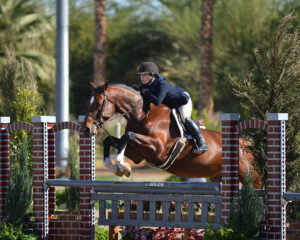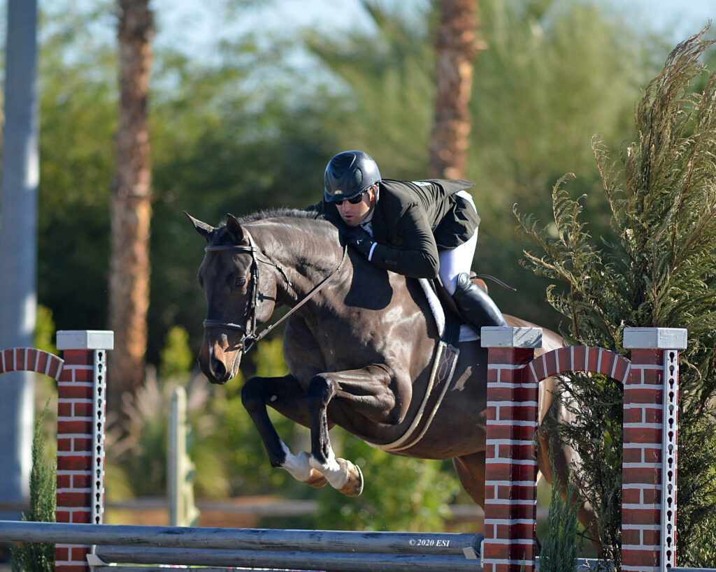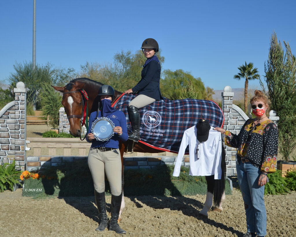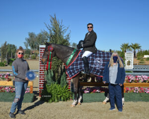THERMAL, Calif. – December 4, 2020 – The inaugural Desert Holiday kicked off hunter derby competition on Friday with the first two of eight hunter derbies to be held over the course of the three weeks. Nick Haness (Temecula, CA) and West Coast Equine Partners, LLC’s Reese’s found their familiar top placing in the $2,500 USHJA National Hunter Derby – Open, sponsored by Horseflight. The pair sat first going into the Handy round with a score of 92 and secured Champion with a second round score of 87.