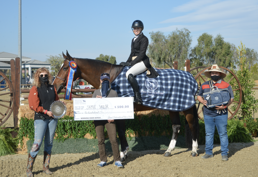 THERMAL, Calif. – December 11, 2020 – Jamie Sailor (Moorpark, CA) and Skyhawk rose to the occasion in Friday’s $10,000 USHJA International Hunter Derby, sponsored by Makoto Farms. The pair navigated through Michael Pegg’s Classic Round to earn scores of 92 and 91 for a 183 total and topped the field with their Handy Round scores of 102 and 104 for a 206 total. In second place was Nick Haness (Temecula, CA) aboard Ecole Lathrop’s Eclair for their scores of 181 and 199. Haness also rounded out the top three, but this time with Double Down Farm LLC’s Caldiano with scores of 185 and 185.