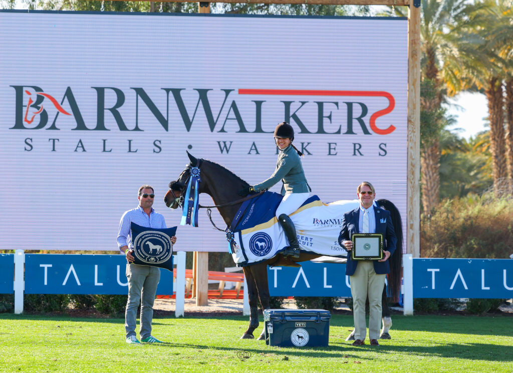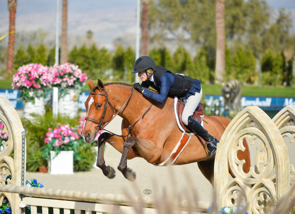 “It’s just so great,” Karazissis said of her first time doing the division in the Grand Prix Arena, a new offering for “Hunter Week” in the desert. “I just love it out there. It’s so much fun. I’ve done derbies out there before and the [WCHR] Spectacular, but to have the whole week in the Grand Prix Arena, I’m so grateful they did that. The horses have fun, it’s a change of scenery, and it’s really fun for us.”