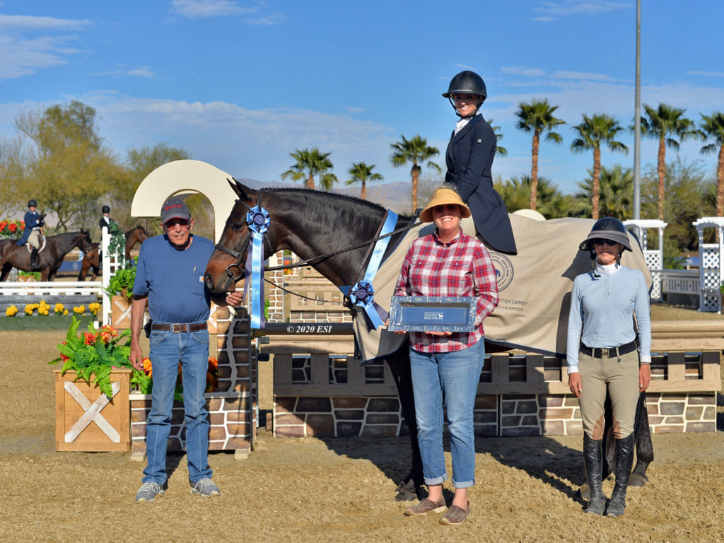 THERMAL, Calif. – February 28, 2020 – Natalie Rae Medlock (Orange, CA) and her own Luciano shared their second derby win in a row after earning top honors in this week’s $7,500 USHJA National Hunter Derby – Junior/Amateur section, sponsored by Round Meadow Farm, with scores of 89 and 94. Cathy Morris-Schmitt (Greenwood Vlg, CO) and her own Andover earned reserve honors with scores of 94 and 84. Samantha Cristy (Sammamish, WA) and For Adventure, owned by Cristy, rode for third place with scores of 87 and 89.