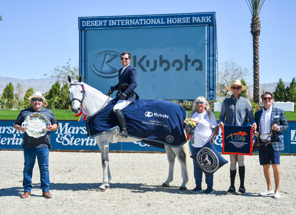 Not long ago, Cavaletto Loma Z was jumping the FEI divisions with international show jumper Ashlee Bond. Fast forward to 2024, he’s winning international hunter derby action with top hunter rider Nick Haness. On Friday of Desert Circuit 9, presented by Kubota, Haness and Cavaletto Loma Z, owned by West Coast Equine Partners LLC, took the win in the $49,900 USHJA International Hunter Derby, sponsored by Kubota.