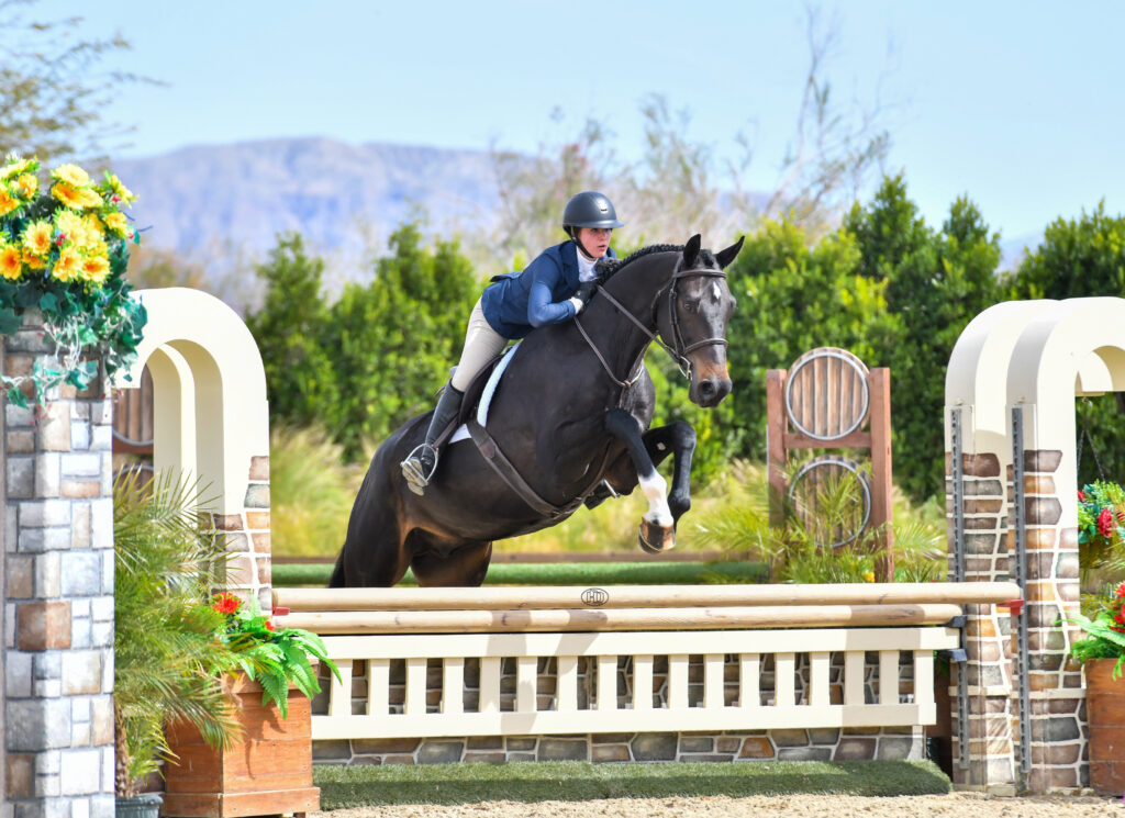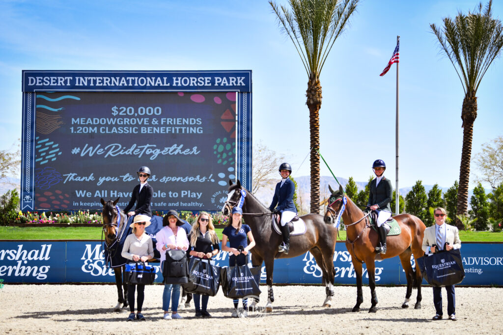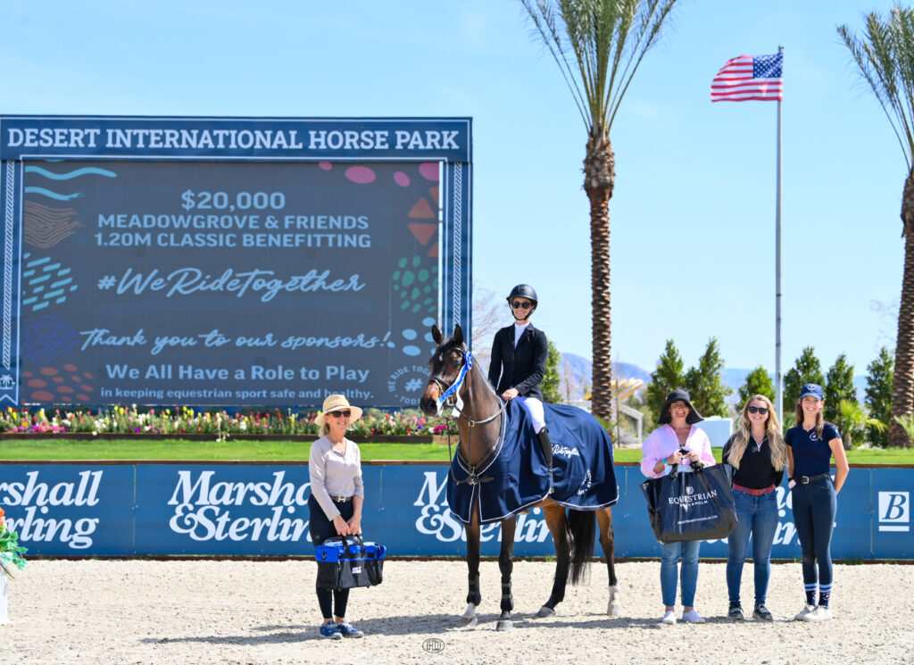 On Sunday morning of Desert Circuit 9, presented by Kubota, 74 entries came forward in the annual $20,000 MeadowGrove & Friends 1.20m Open Classic to help support the mission of #WeRideTogether to champion a healthy sport environment. With even more support than the first year, plus dozens of prizes for participants and winners, the class was a huge success, especially for Jacqueline Chawke, who took the win aboard Wrenwood Polly Pocket.