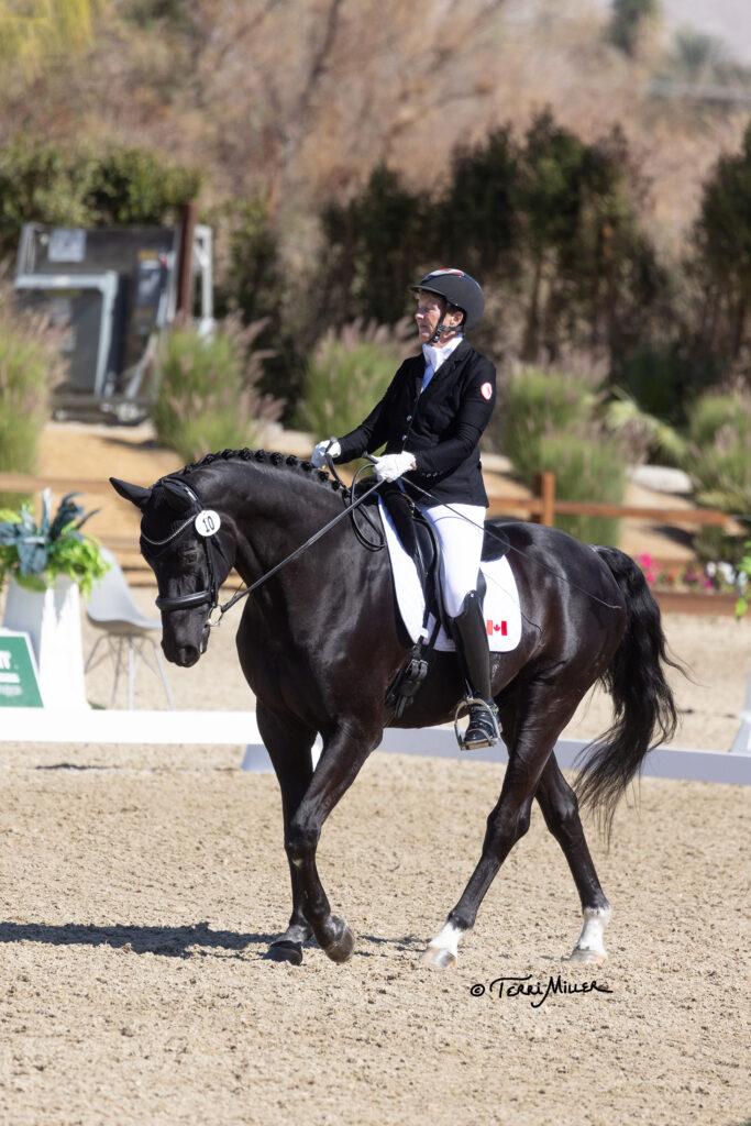 Coming in second place was Shelley Lawder on her 14-year-old Hannoverian mare, Zaouira. Most recently campaigned by owner, Linda Houweling, also of Canada, Lawder and Zaouira also made it a night of firsts coming out of a brief hiatus from the world stage. Though, one would never know the pair had not set foot in an international competition since 2018 as they breezed through the complex test with ease, scoring a 67.587% for the red ribbon.